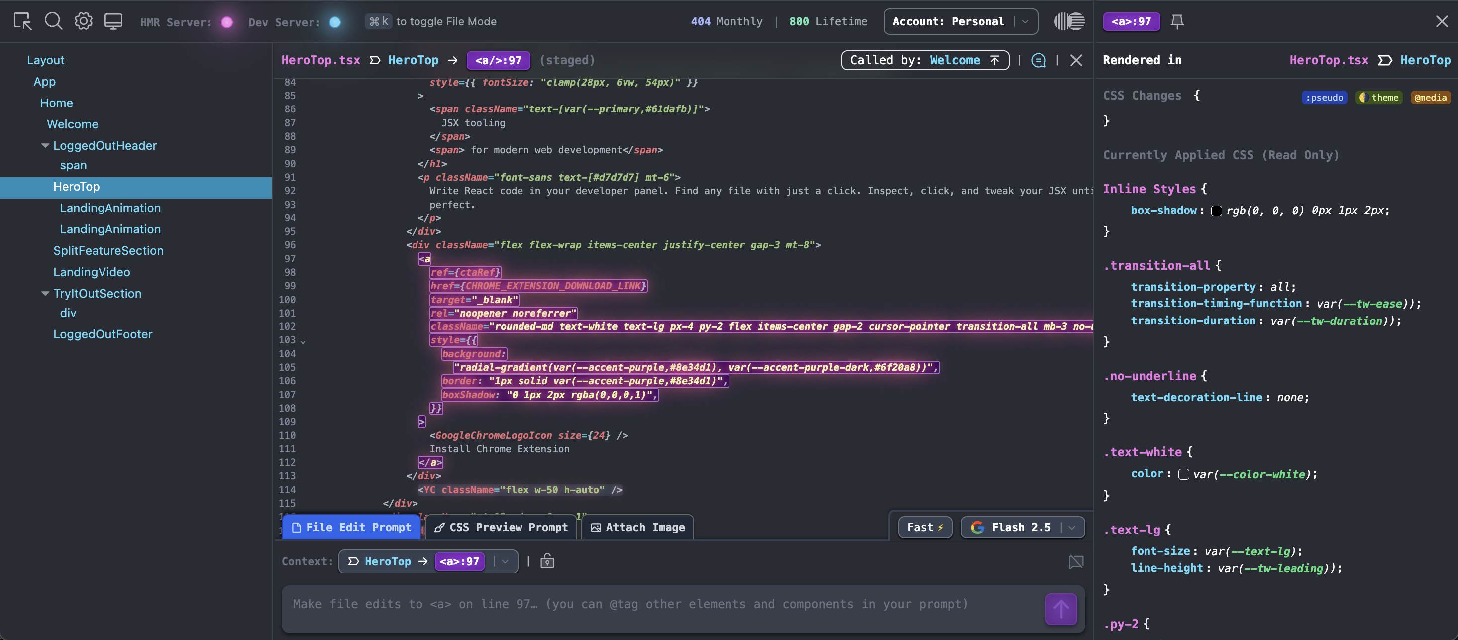 Find any line of JSX in your codebase and manually edit it without ever leaving your browser.